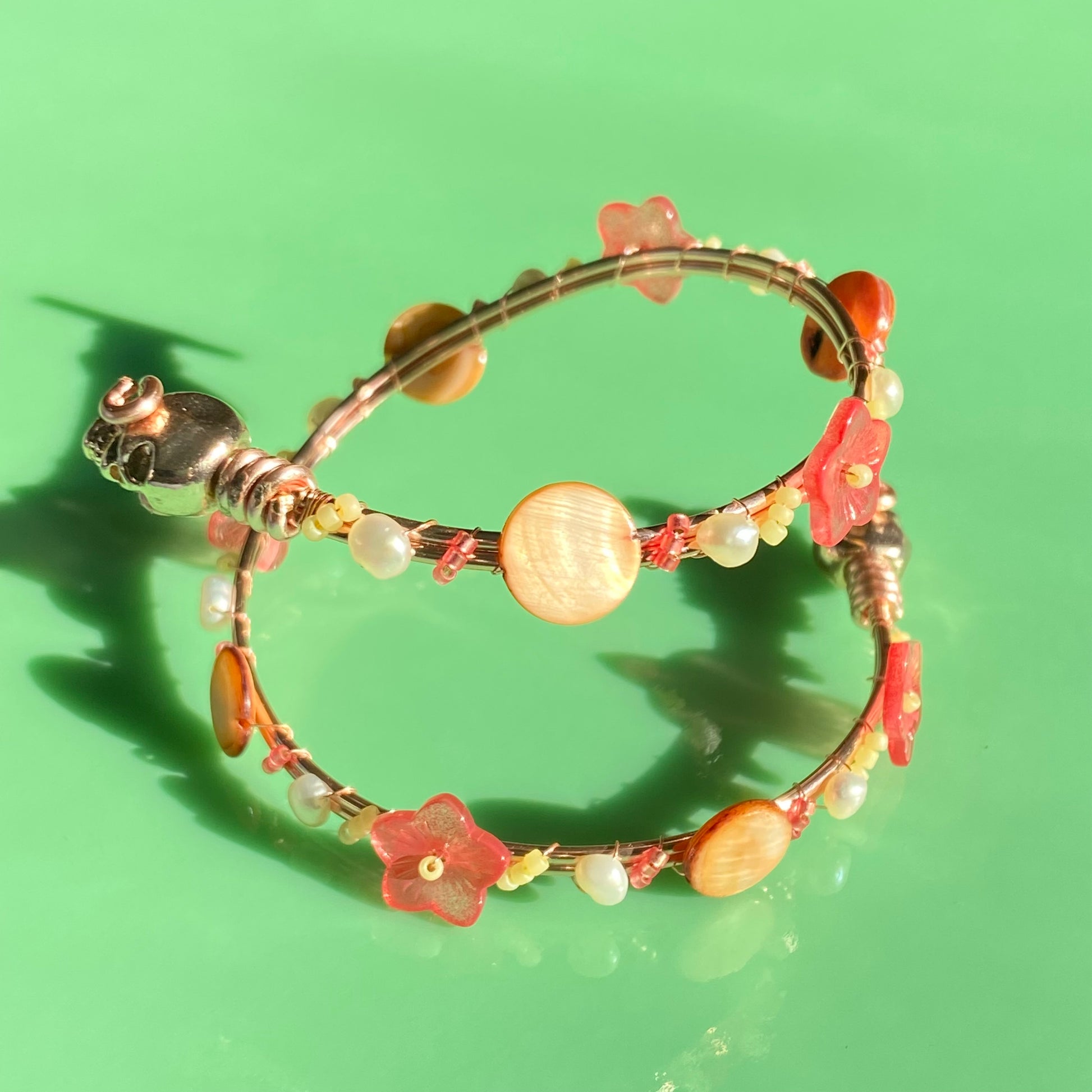 Cuff- 6.5” rose gold coated copper with peach coin shell, white pearls, coral flowers, butter yellow beads, and rose gold metal skull bead details.