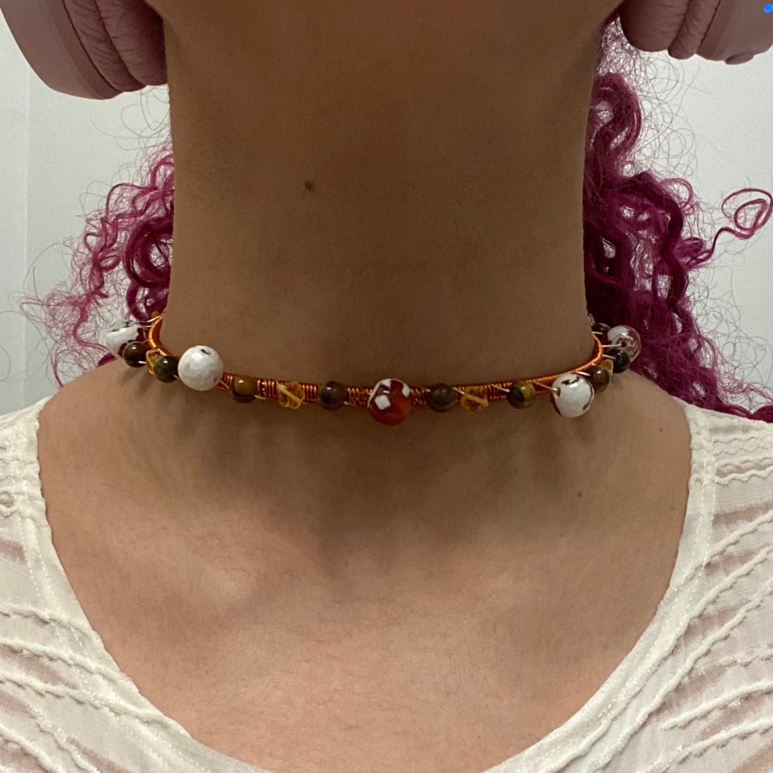 13” features orange and gold coated copper wire with “snow covered” orange agate, tigers eye, and mini star beads. Not adjustable.