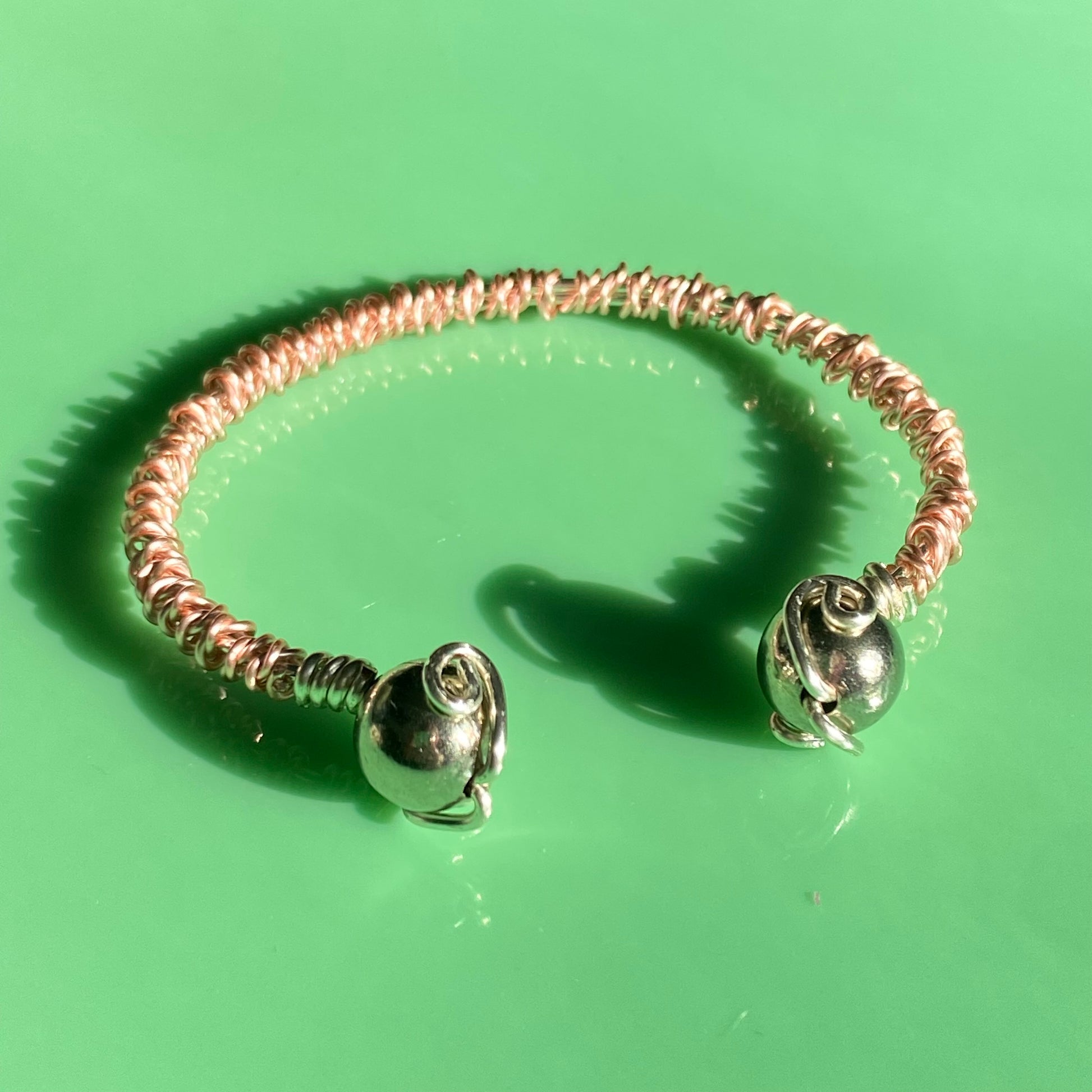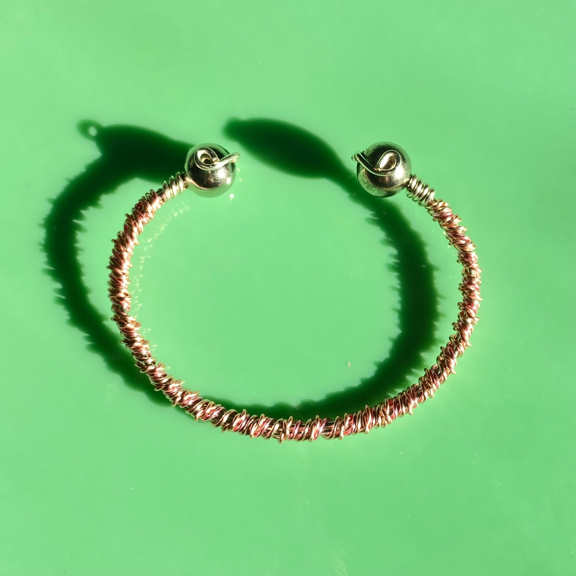 Pink “barbed” silver cuff- 6.5” features pink & silver coated copper wire to emulate the look of barbed wire, with silver ball details.
