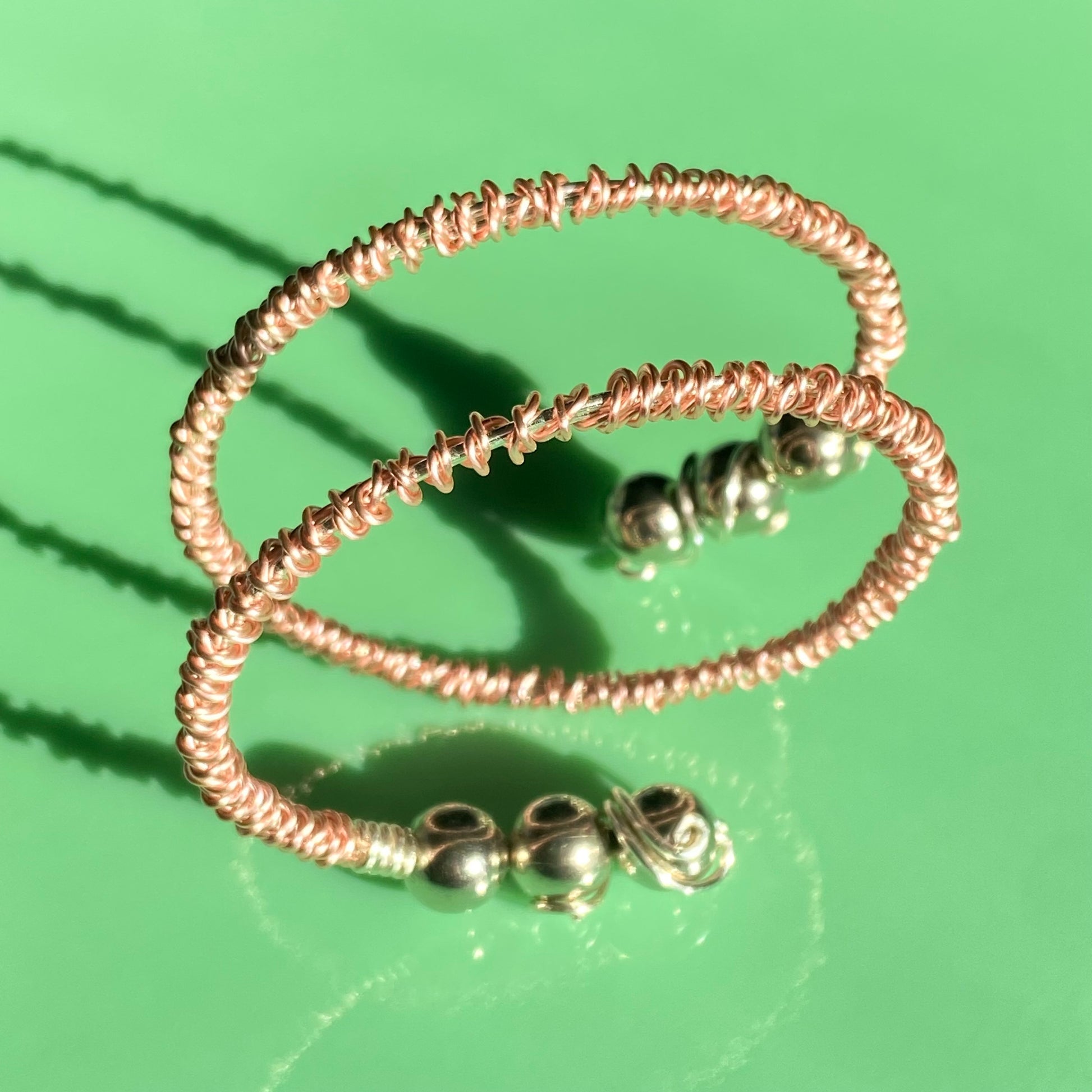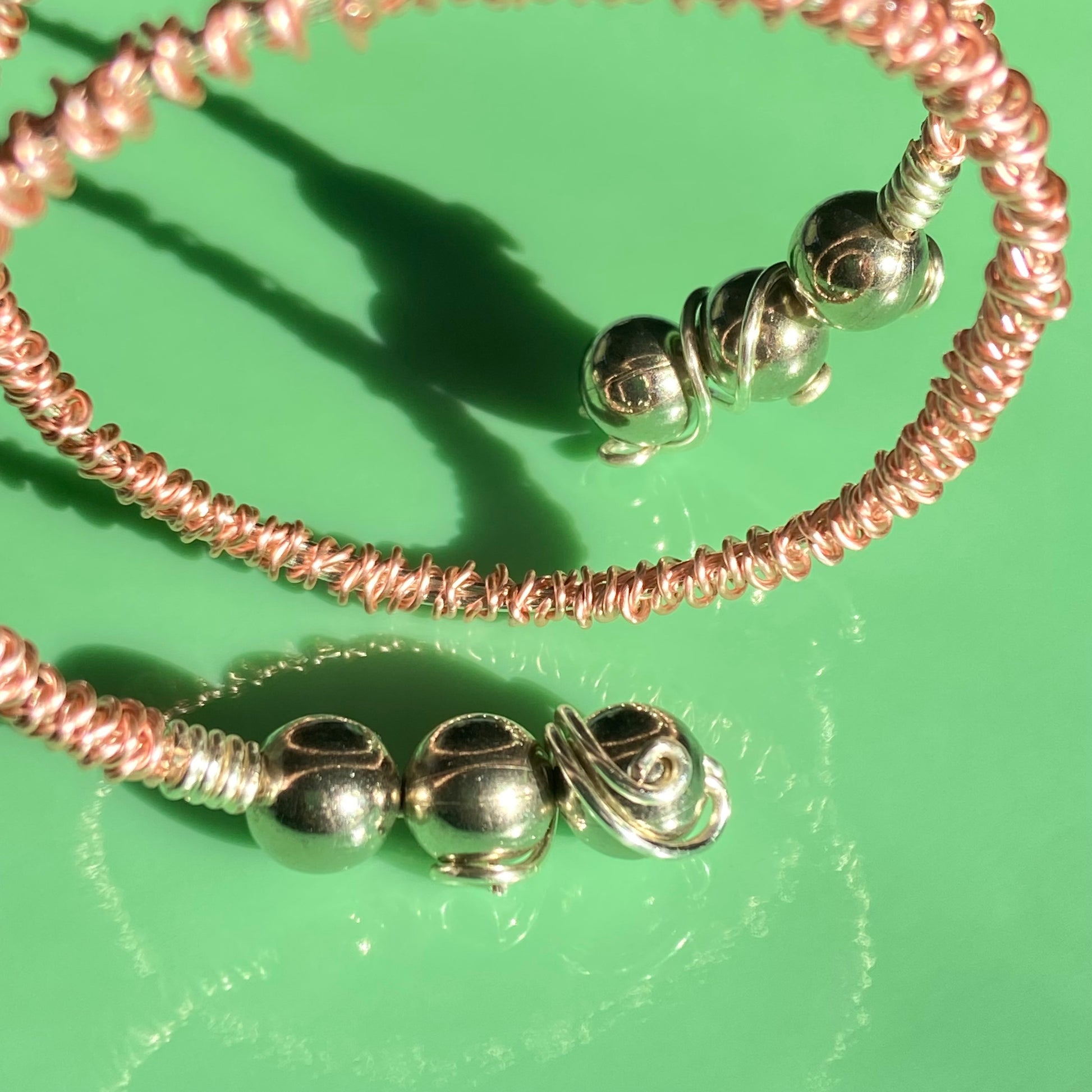 16” features pink & silver coated copper wire to emulate the look of barbed wire, with silver ball details. Can be adjusted into a necklace/choker.