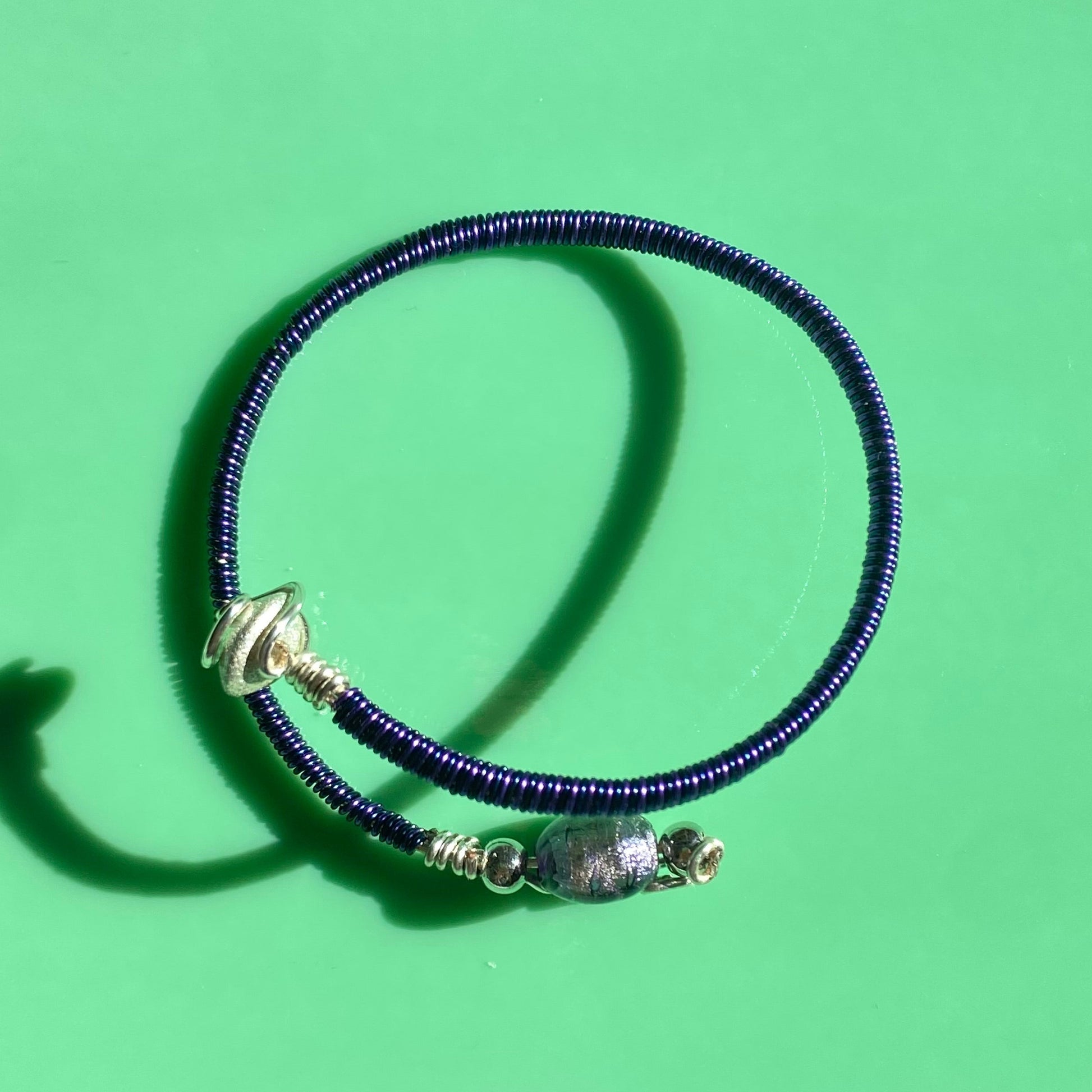 14.5” features navy, purple, and silver coated copper wire with purple and blue bead detailing. Can be adjusted into an arm cuff.