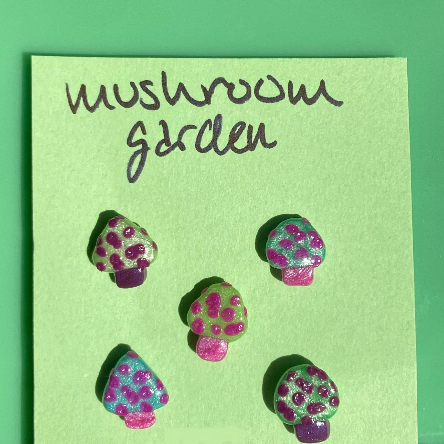 Set of 5 mini mushroom pins in a magenta, purple, green, and blue colorway.